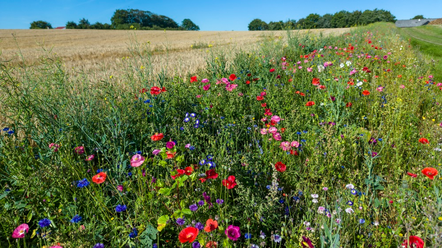 Vilde blomster, bier og sommerfugle trives her.